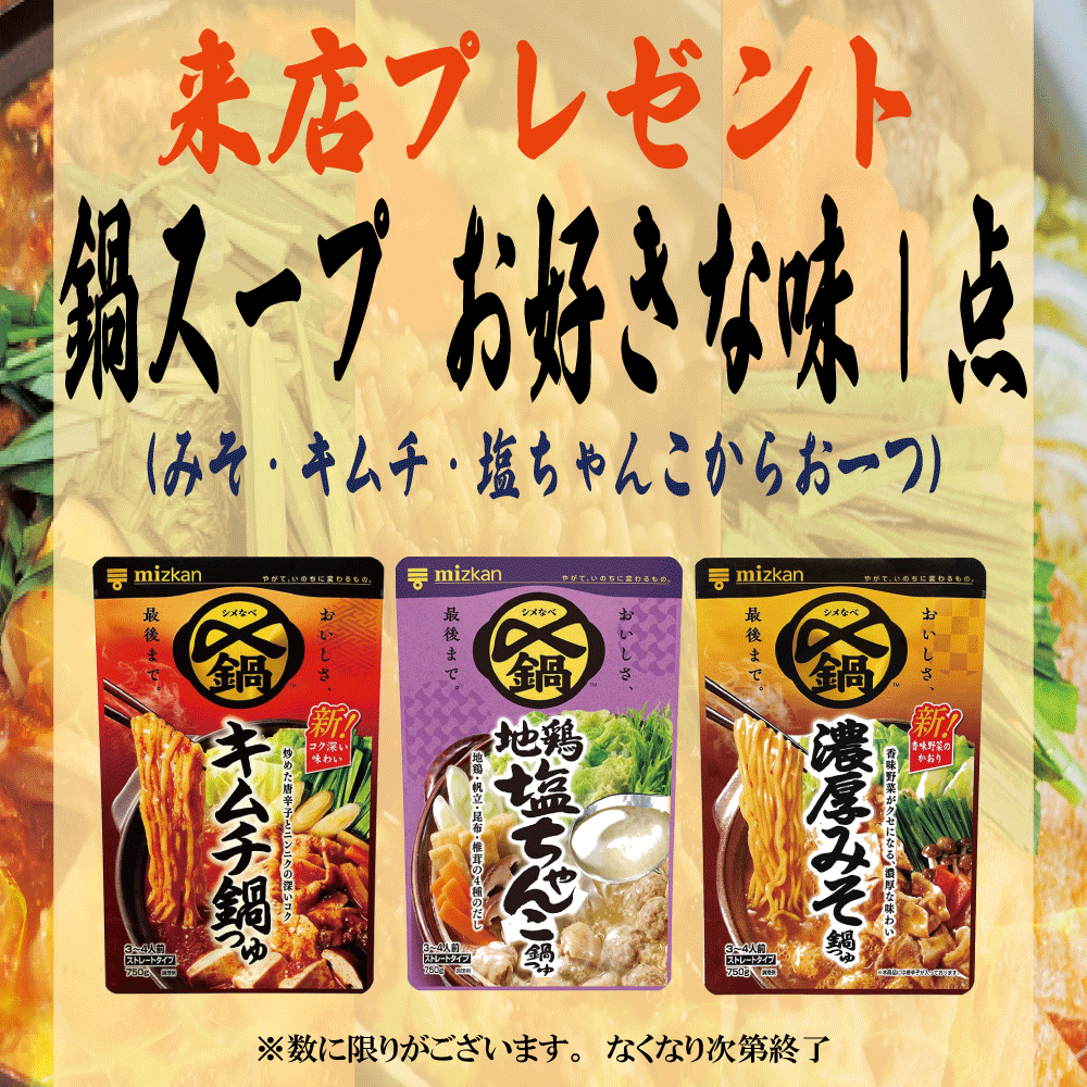 11月と言えばもう相当な寒さ!凍えそうな季節に家で、何をフーフーするの?もちろん鍋ですね!手軽においしい鍋料理がみんなで楽しめるということで評判の鍋スープをご来店時にプレゼントいたします!